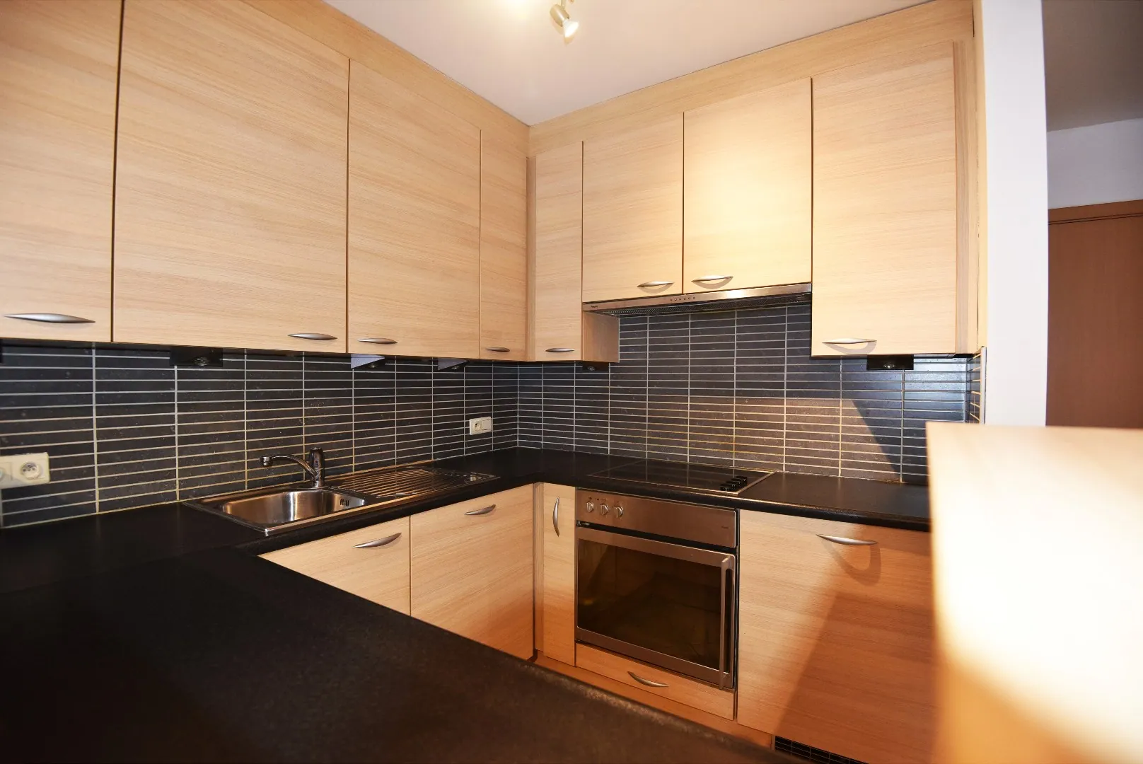 Gelijkvloerse studio (41m²) met open keuken met spoelbak, keramische kookplaat, dampkap, oven, koelkast en vaatwasser, living / slaapruimte met ingemaakte kasten, badkamer met lavabomeubel en douche, toilet. Garagebox inbegrepen.