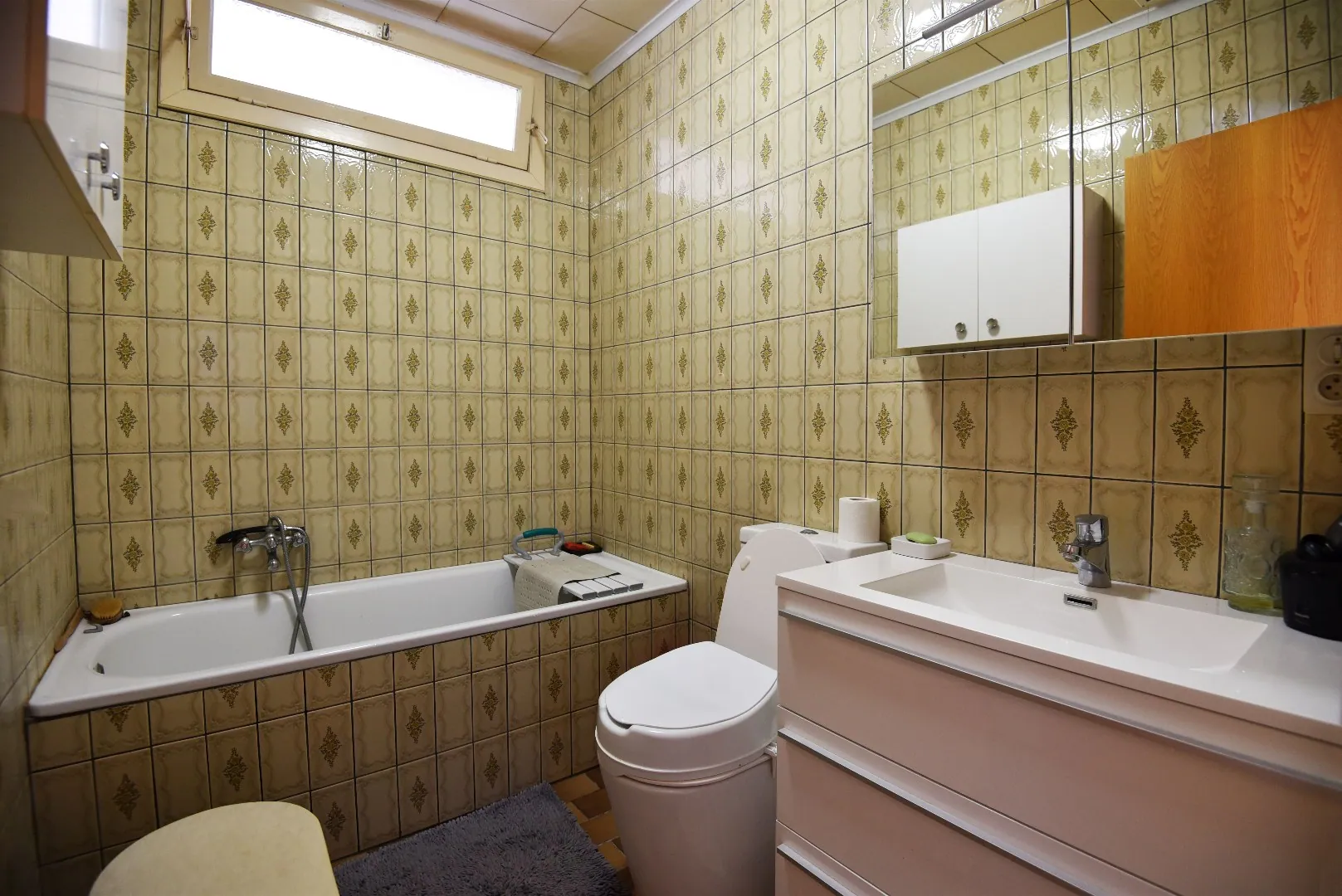 - badkamer met toilet, ligbad, lavabomeubel